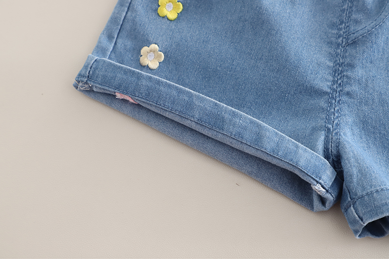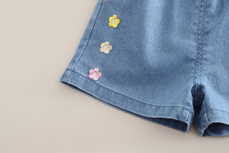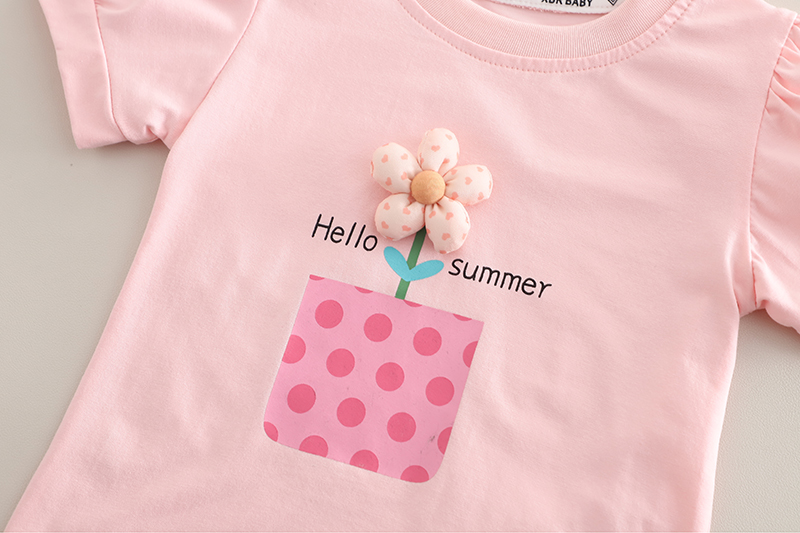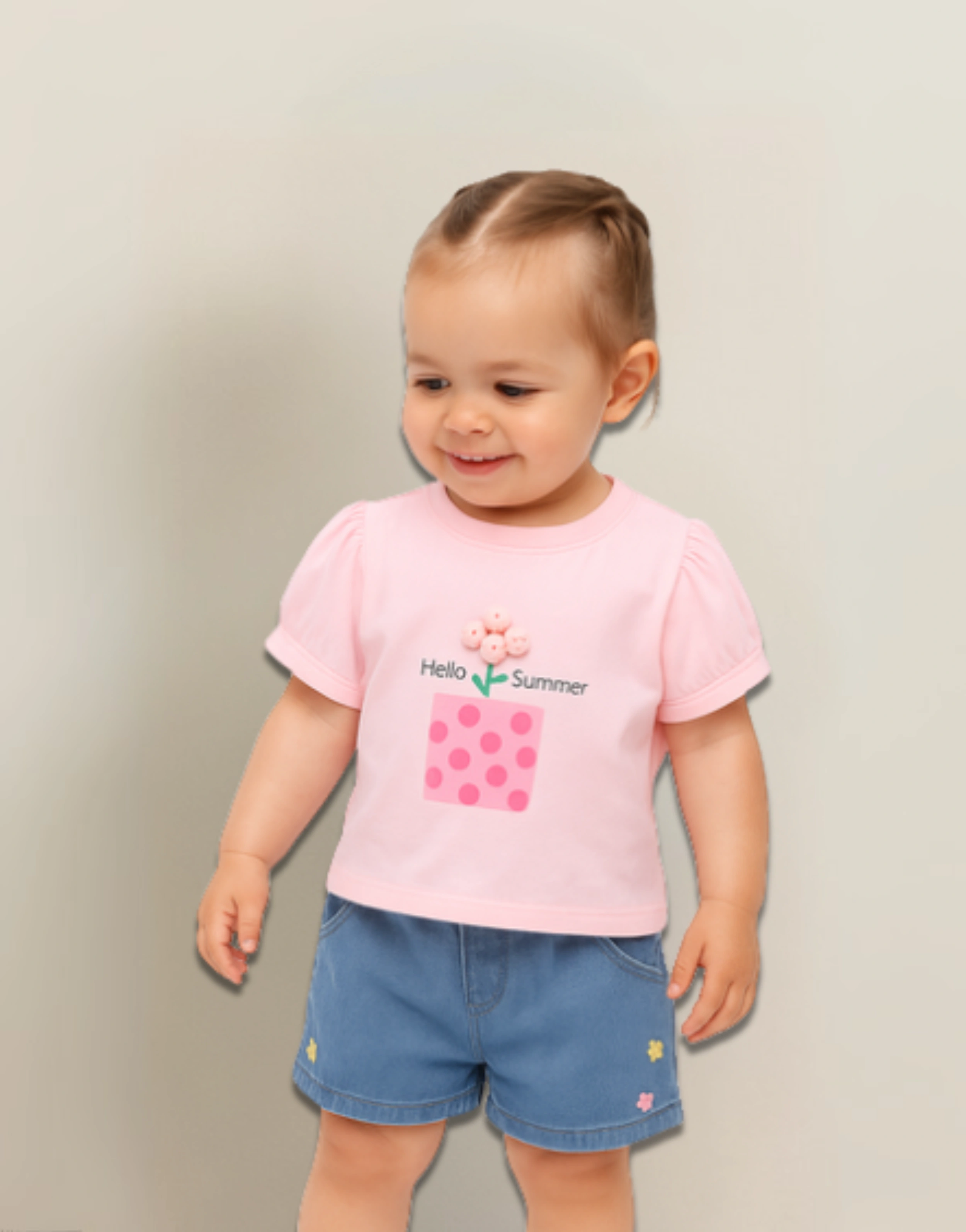 Add charm to your child’s day with this soft pink flower-print tee, featuring a cute 3D floral pot design and “Hello Summer” message. Paired with denim shorts adorned with tiny embroidered flowers, it’s a cheerful and comfy pick for sunny outings and sweet memories.
