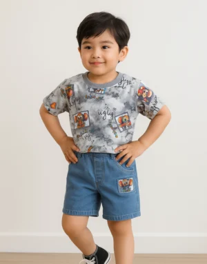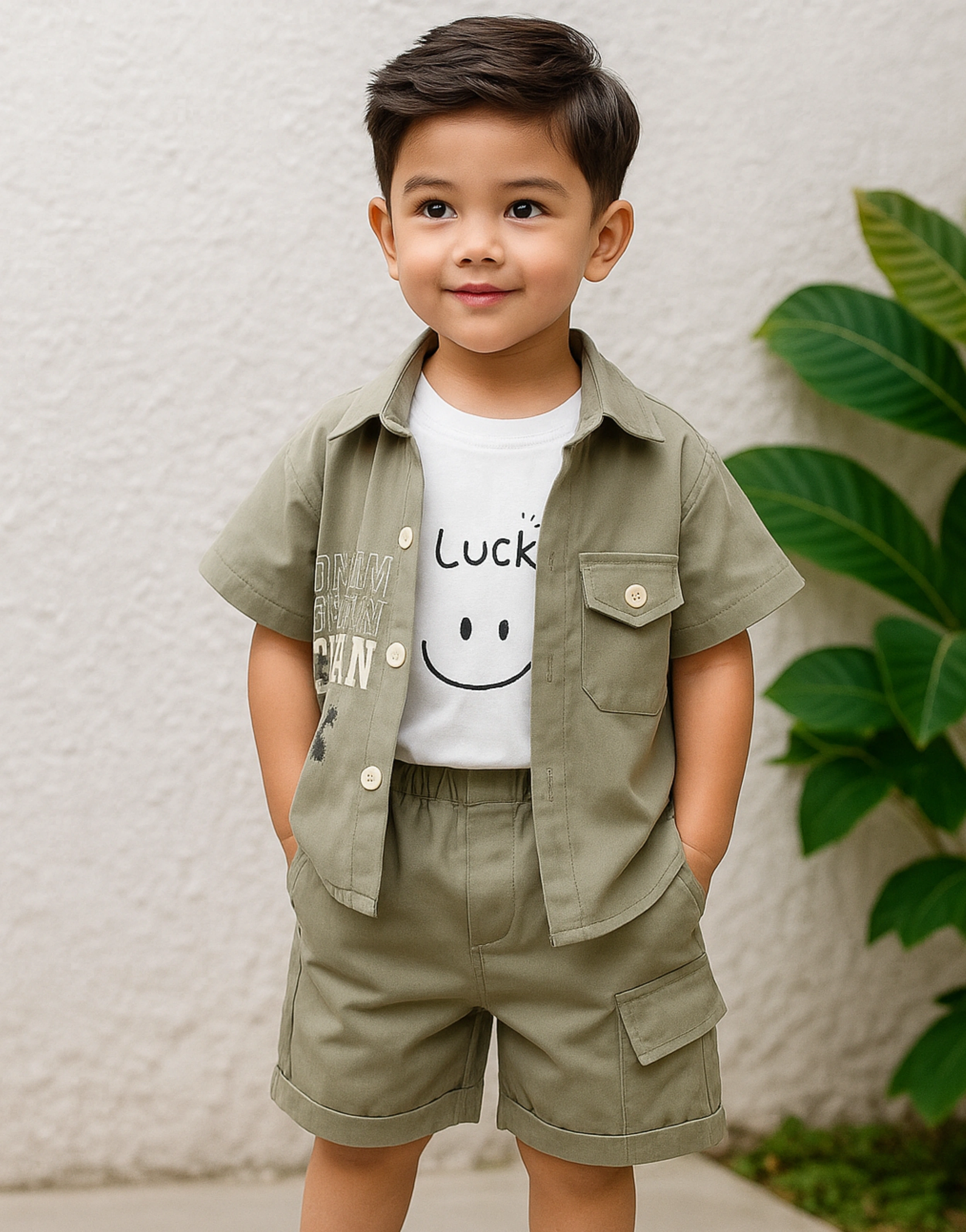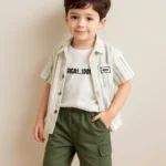 Keep your little one cool and confident with this breezy green-striped open shirt layered over a bold graphic tee. Matched with comfy olive green shorts, this set is a perfect blend of comfort and street-smart style for sunny-day adventures.
