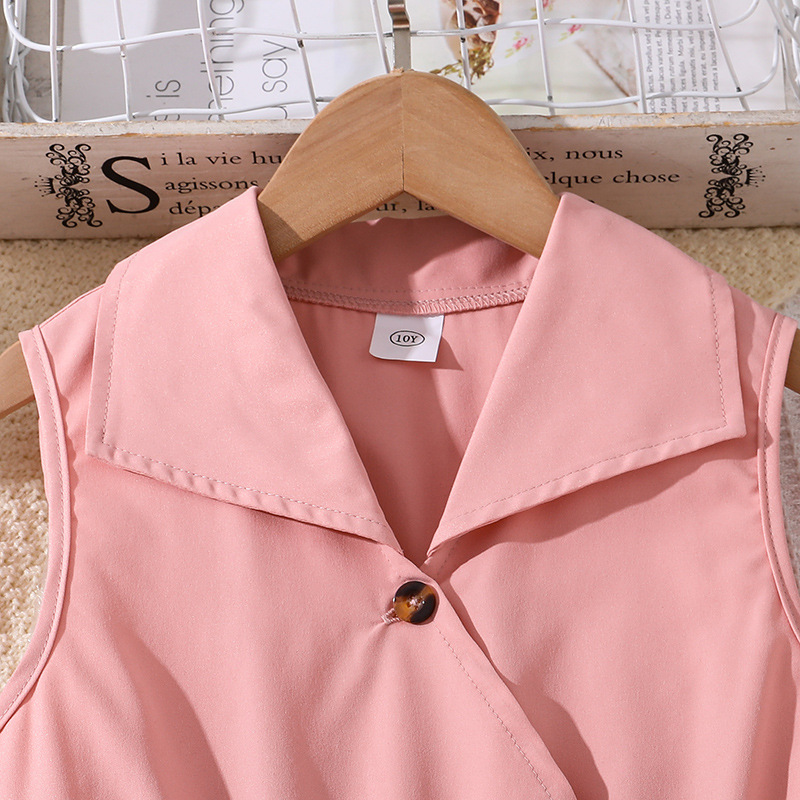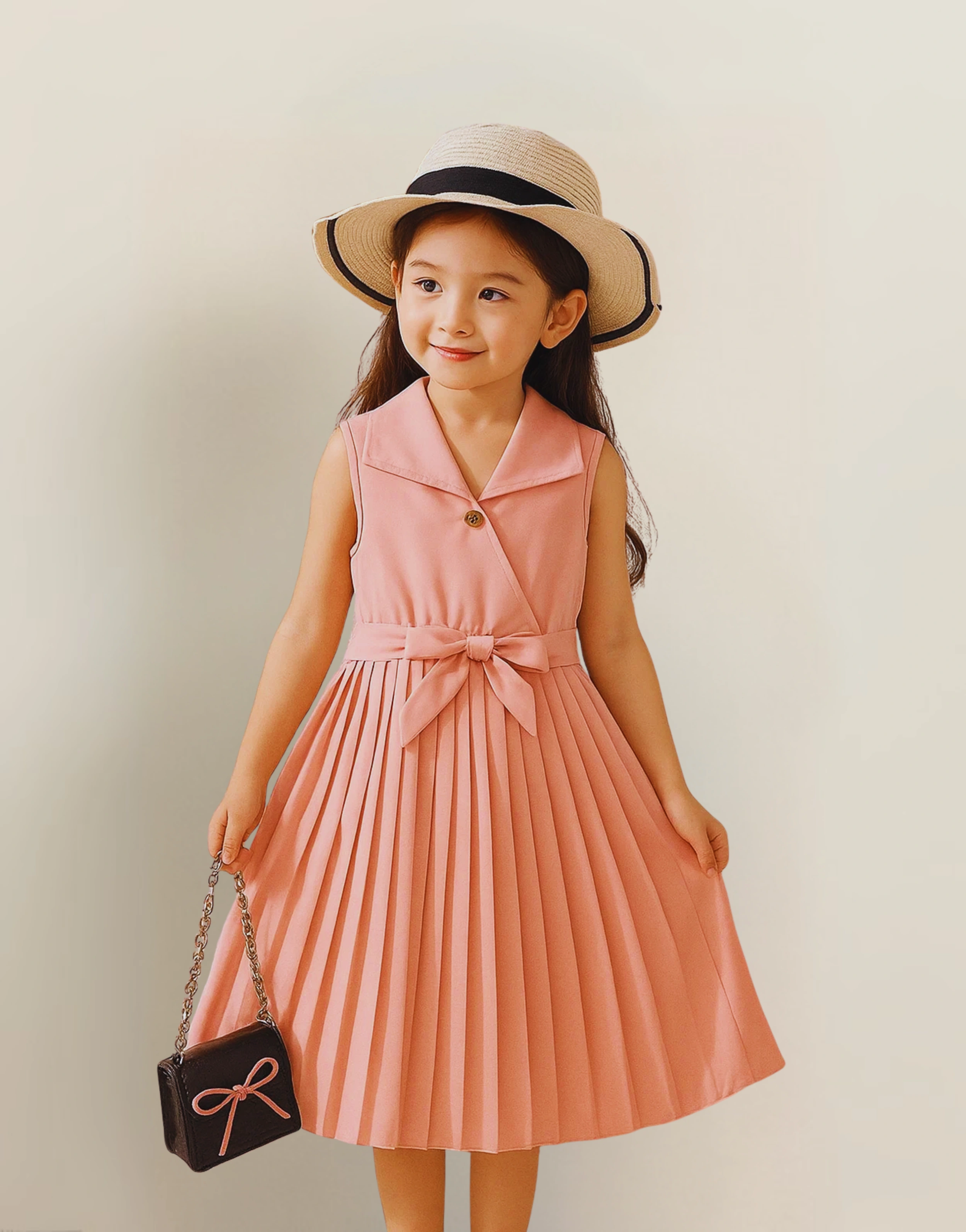 Add charm to your child’s day with this sleeveless blush pink dress, featuring a smart shirt-style collar and beautifully pleated skirt. Designed with a matching waistband for a polished finish, it’s a graceful and stylish pick for parties, outings, and picture-perfect twirls.