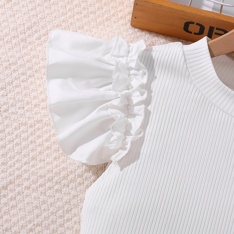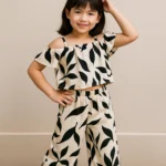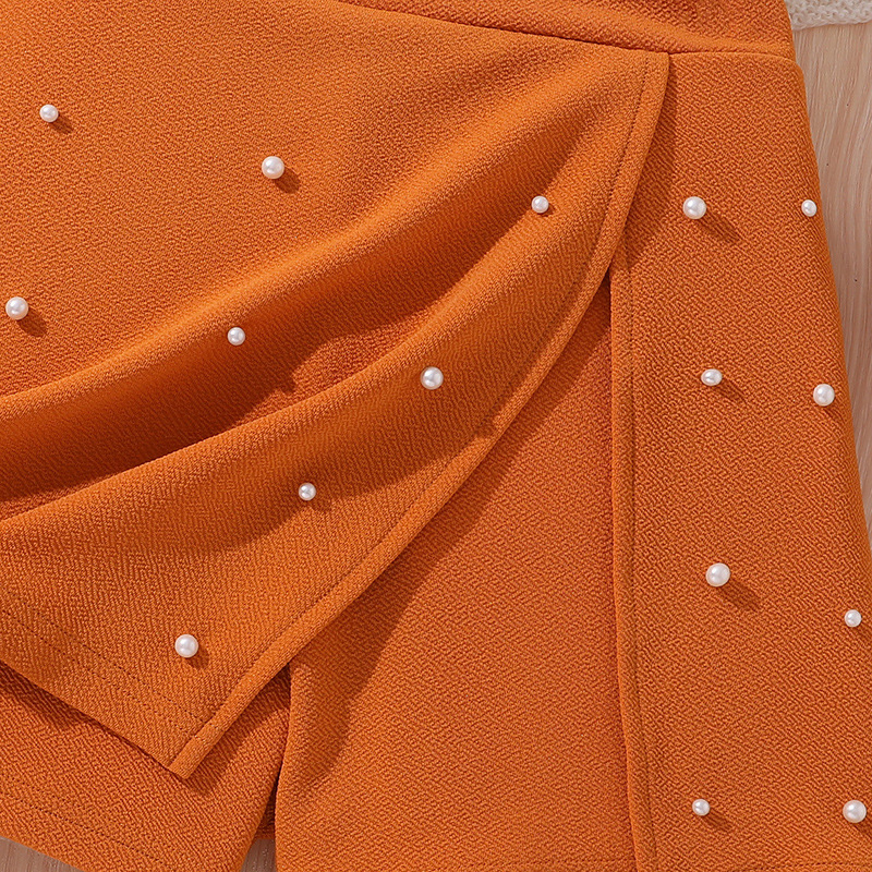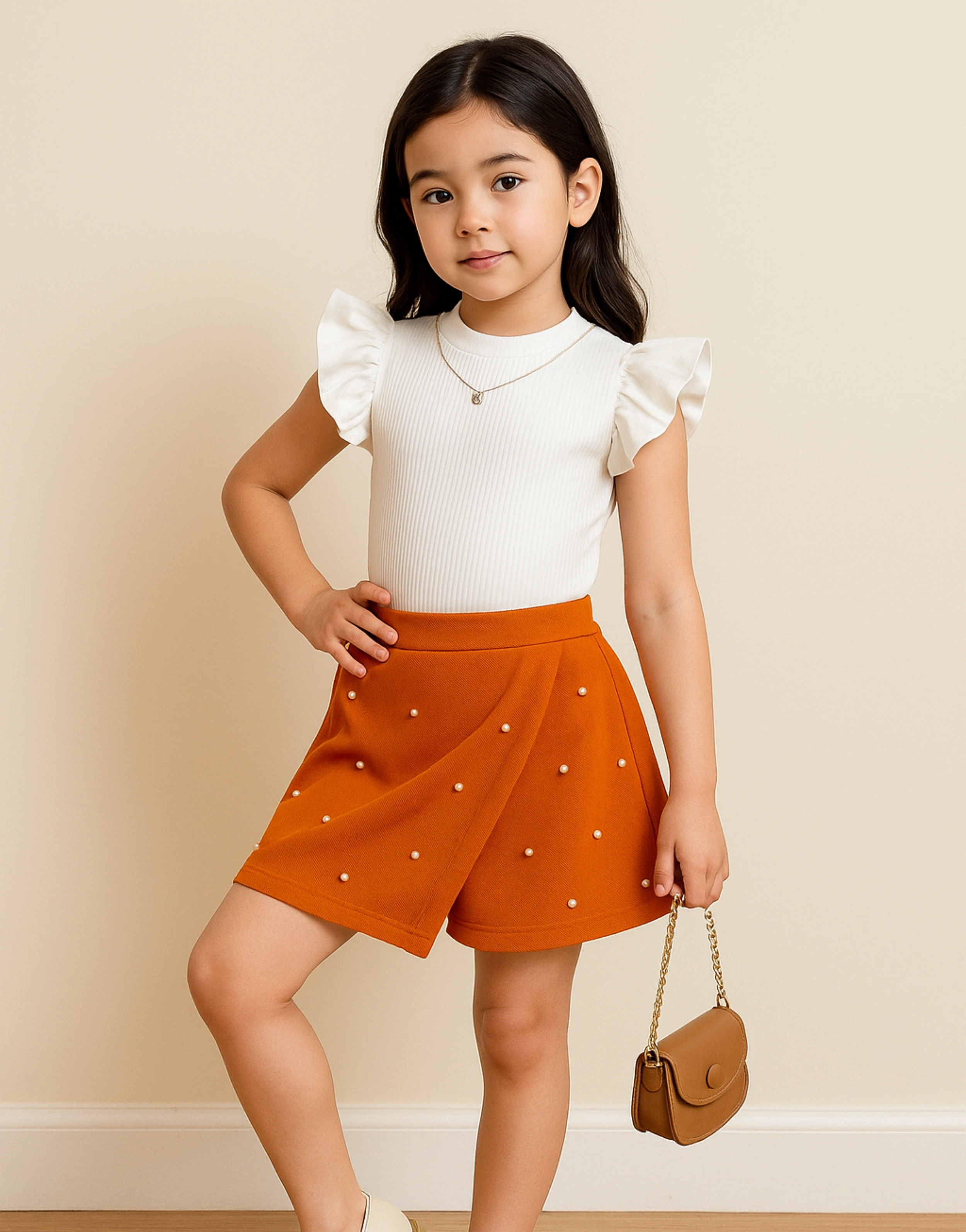 Add charm to your child’s day with this elegant white ribbed top featuring delicate ruffle sleeves and a touch of sparkle. Paired with a stylish burnt orange skirt embellished with mini pearl details, it’s a graceful and trendy pick for festive outings and fashionable fun.