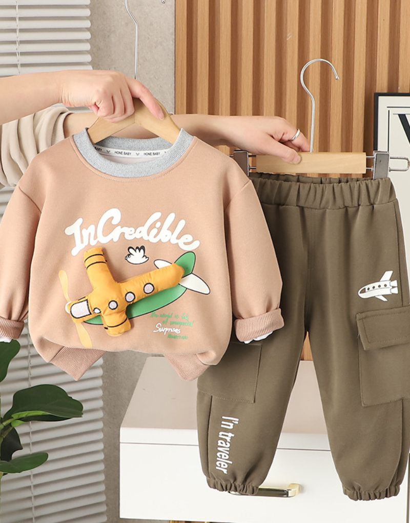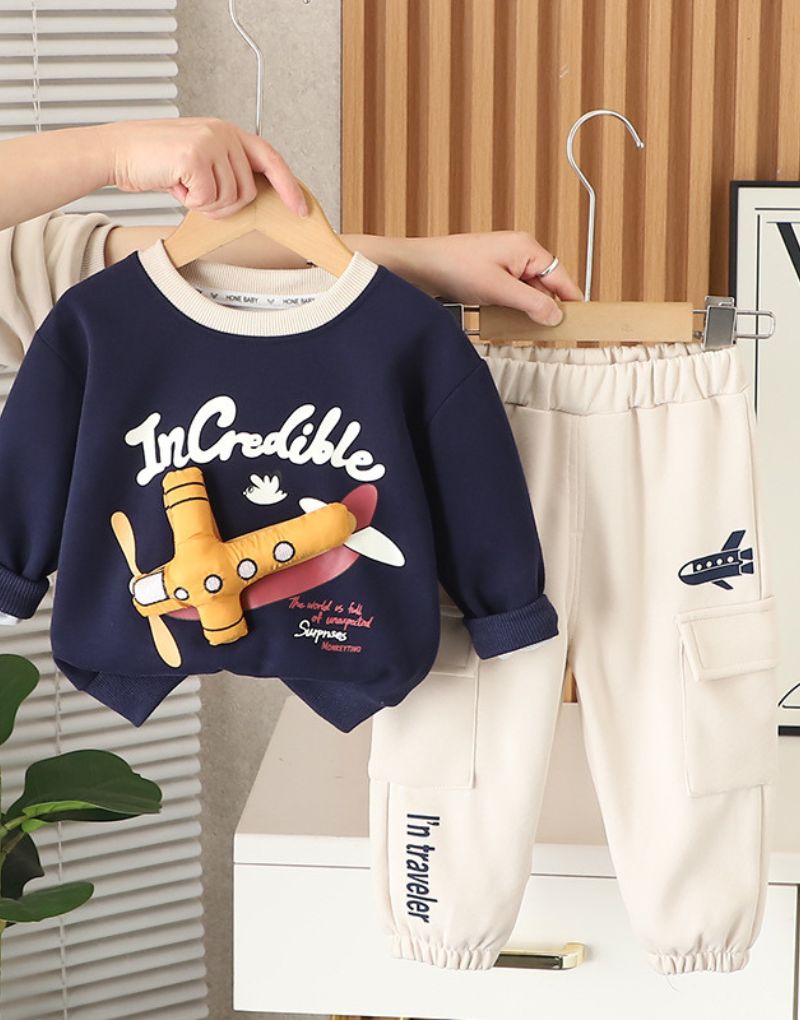 Let your little pilot soar in style with this navy and cream co-ord set! The sweatshirt pops with a playful 3D airplane design and bold “Incredible” lettering, while the joggers feature airplane prints and handy pockets for extra coolness. A comfy yet stylish outfit that’s perfect for school, playdates, or everyday adventures.