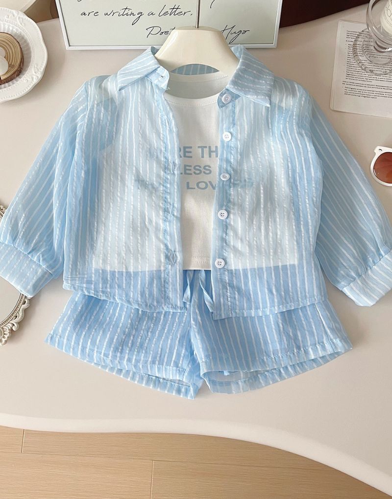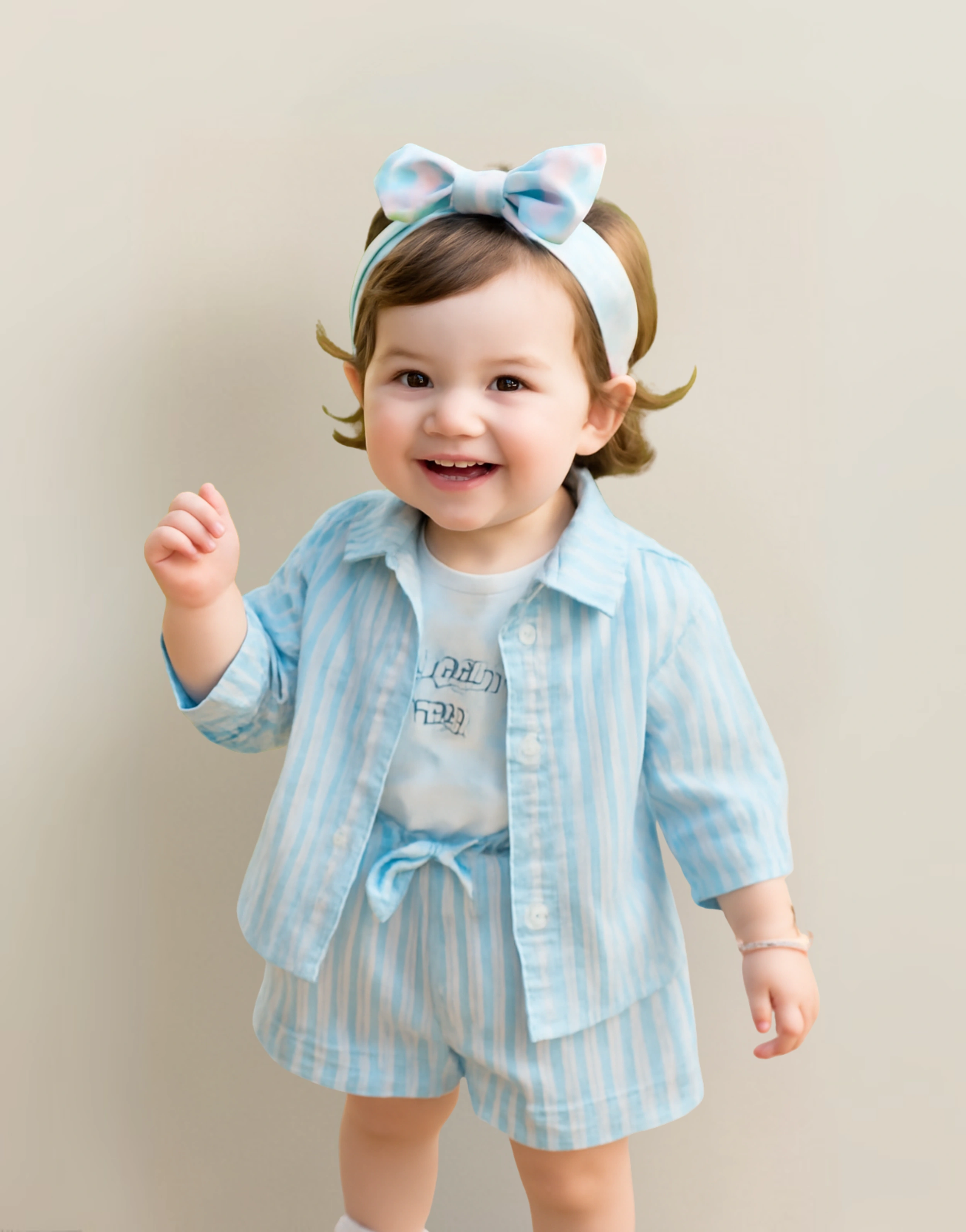 Bring effortless style to your child’s day with this lightweight sky blue striped shirt set. Paired with matching shorts and a soft white tee underneath, this outfit is perfect for playdates, outings, or a casual stroll. Designed for comfort and cuteness, it’s a must-have for warm weather fun.