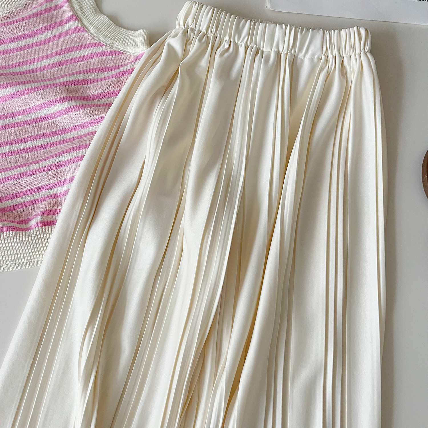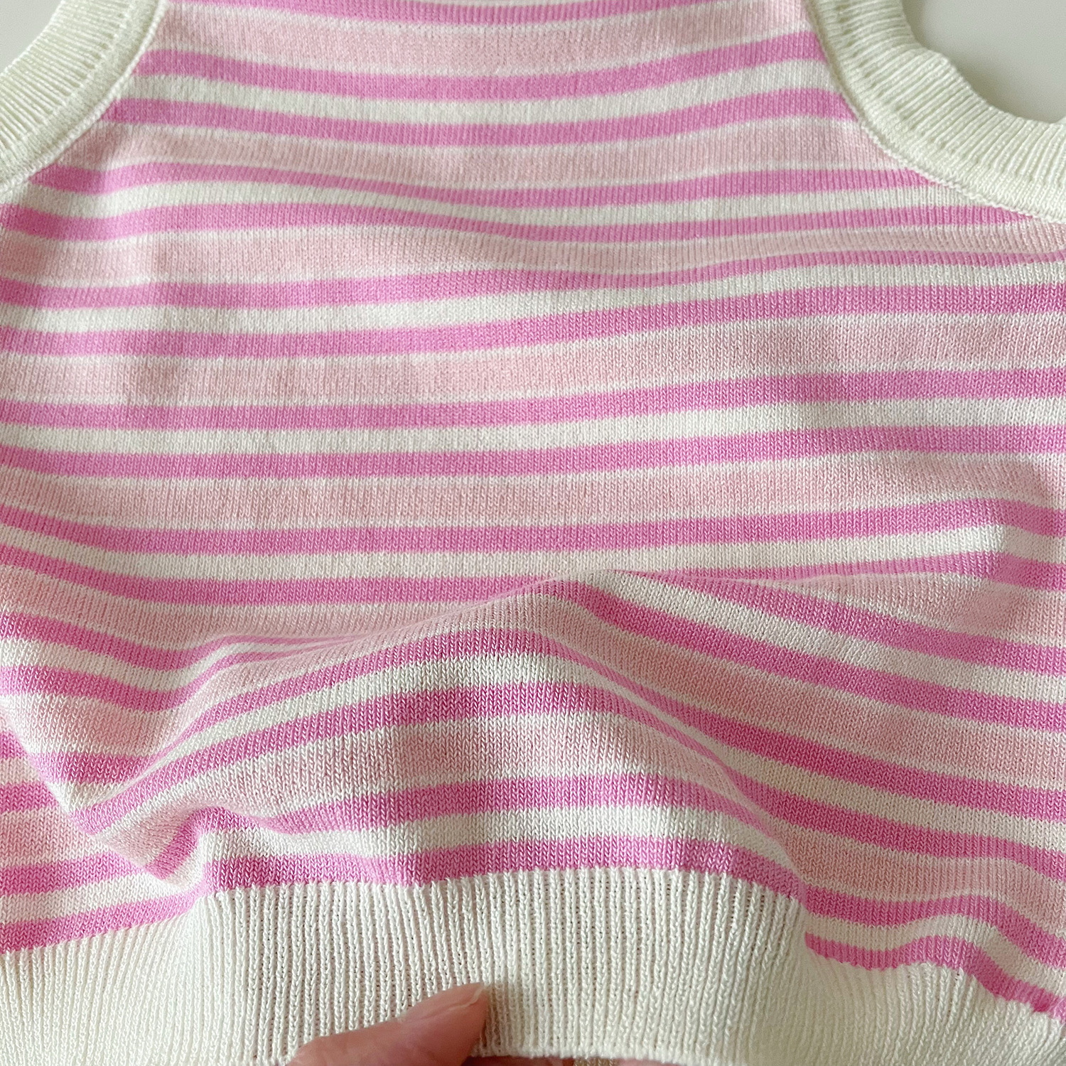 Brighten up your little one’s day with this adorable pastel set, featuring a soft pink-and-white striped sleeveless knit top paired with a flowy cream pleated skirt. Perfect for sunny strolls, playdates, or stylish casual outings, this set brings together comfort and charm with a breezy flair.