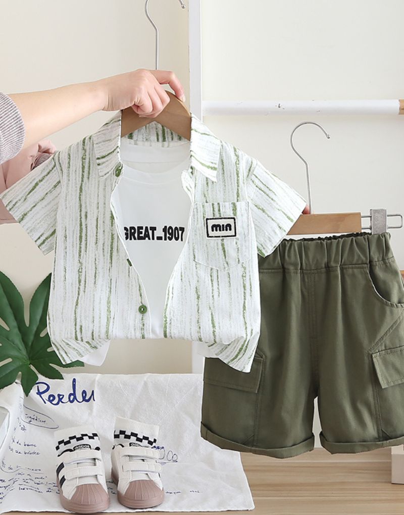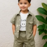 Keep your little one cool and confident with this breezy green-striped open shirt layered over a bold graphic tee. Matched with comfy olive green shorts, this set is a perfect blend of comfort and street-smart style for sunny-day adventures.
